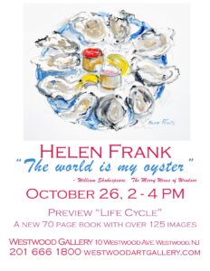 Westwood- Westwood Gallery is pleased to welcome artist Helen Frank to an opening reception and book signing Sunday October 26th, from 2 to 4 PM. The exhibit features new work and works included in her new book, “Life Cycle”. The gallery is open to the public and the exhibit will continue through November 26th, 2025. Westwood Gallery is located at 10 Westwood Avenue and is open 10-6 Tuesday thru Friday and 10-5 on Saturday. For more information call 201 666 1800 or online at westwoodartgallery.com